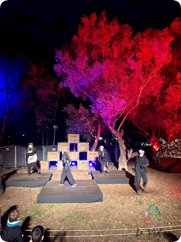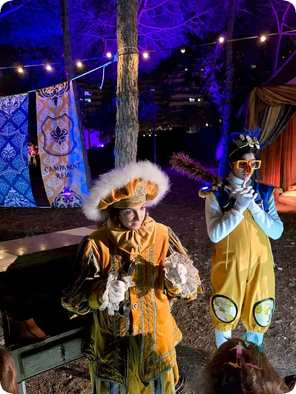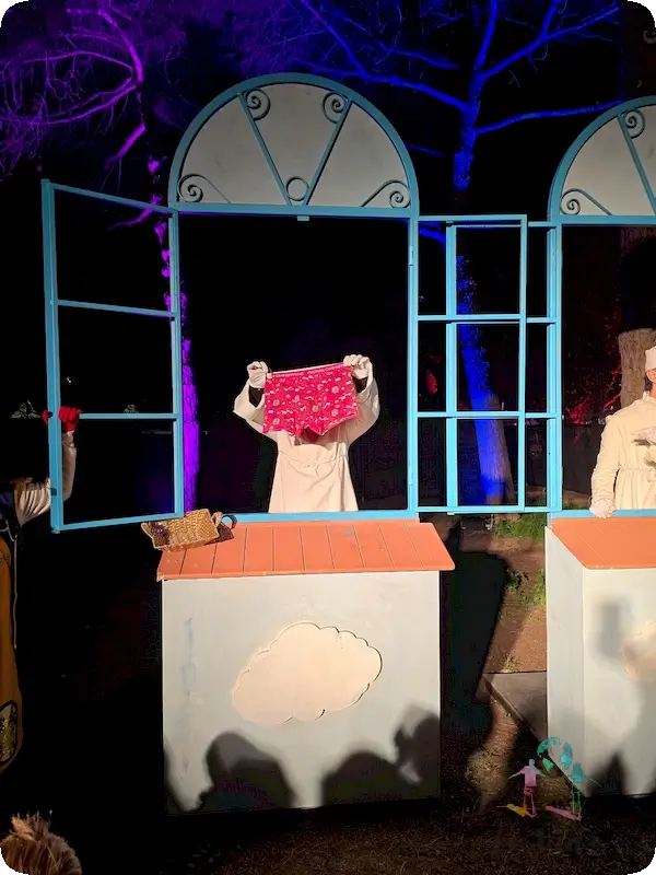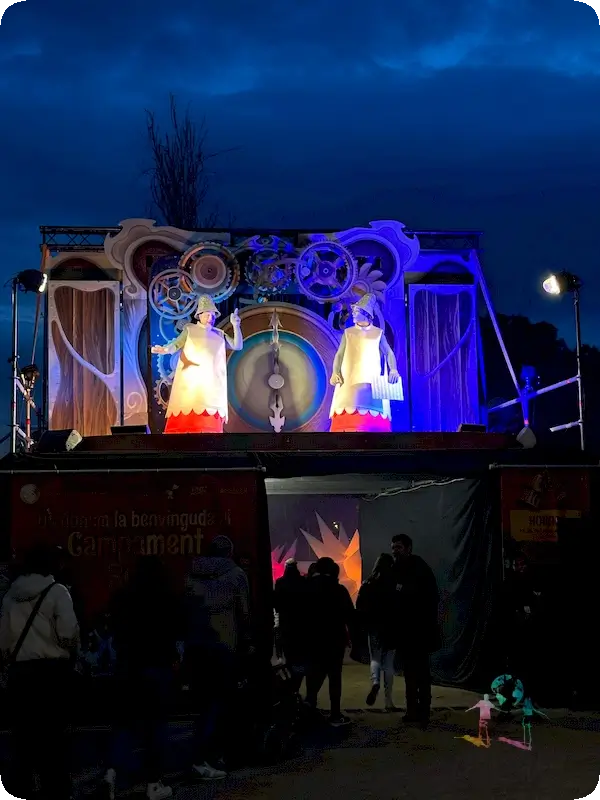 El Parc de les Planes se transforma por completo. Nada más entrar, os sentiréis dentro de una fábrica de sueños al aire libre. Lo que más nos gusta es que no es una simple entrega de cartas, sino un recorrido teatralizado donde vemos: