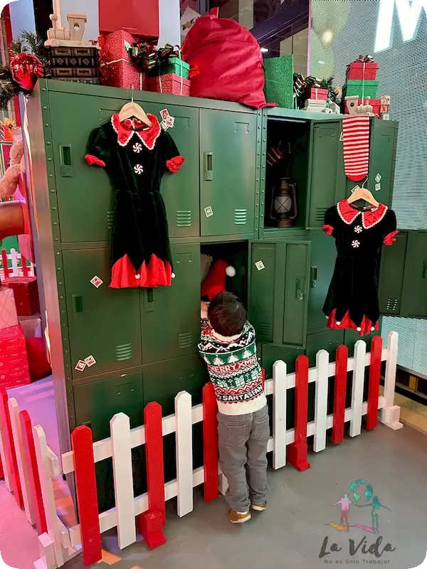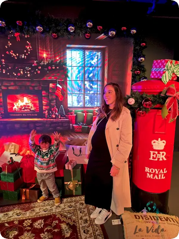 Subimos luego a los pisos superiores, donde nos esperaba un recorrido lleno de decoraciones navideñas y rincones para hacer fotos. Había un trineo de Papá Noel, una casita de madera decorada como la del Polo Norte, y varios espacios llenos de luces cálidas donde cada familia encontraba su rincón ideal para posar.