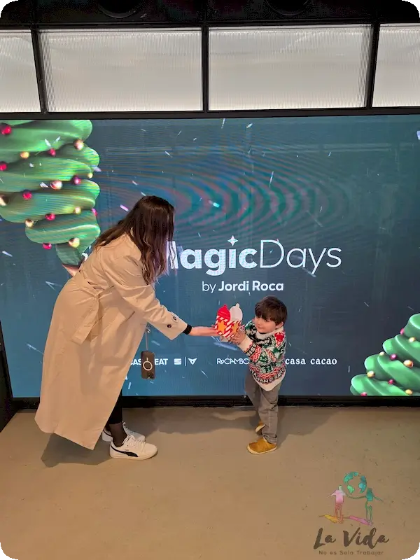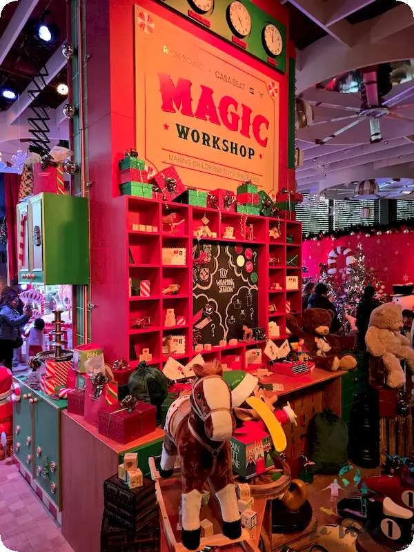 Eric no sabía dónde mirar primero; corría de un lado a otro con los ojos brillando, y nosotros disfrutábamos de verlo tan emocionado. Todo estaba cuidado al detalle: los colores, la iluminación, el olor a cacao y canela… incluso la música de fondo contribuía a esa sensación mágica que solo la Navidad sabe provocar.