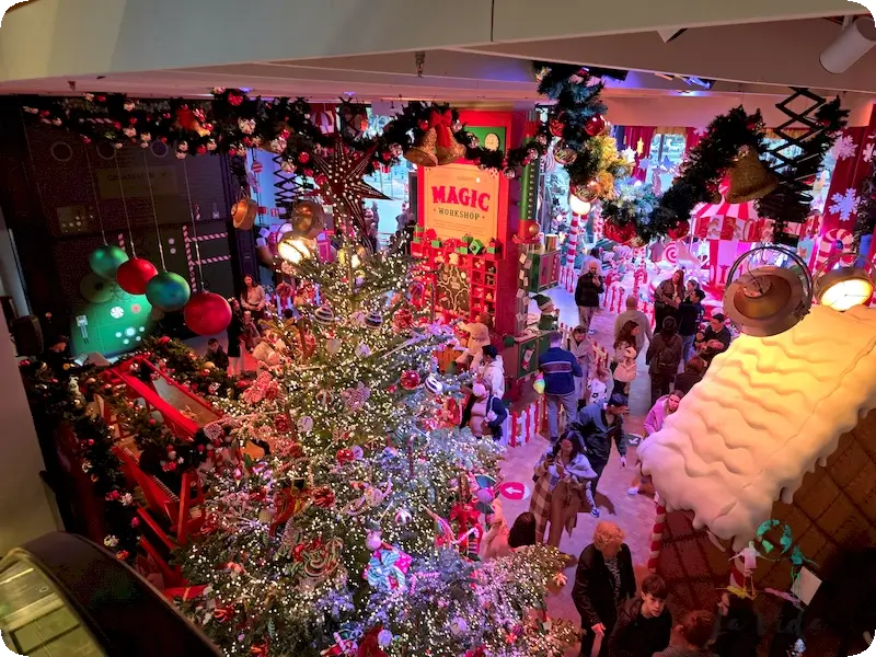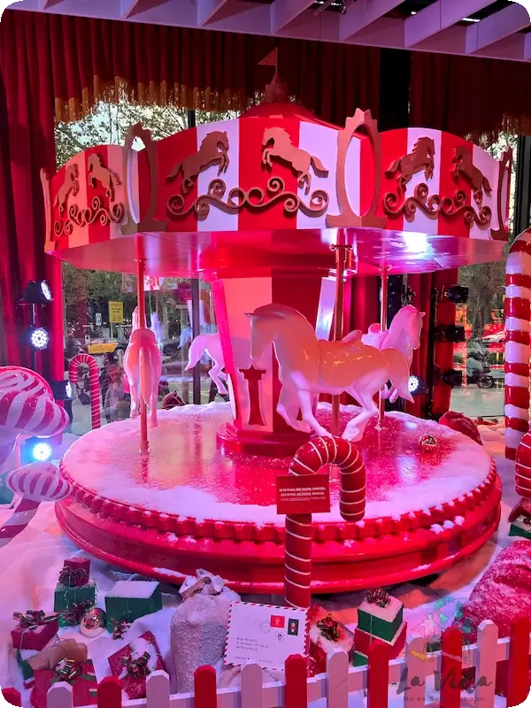 Nada más cruzar la puerta, la planta de entrada nos dejó con la boca abierta. El espacio entero se había transformado en un escenario de cuento: caramelos gigantes, bastones de menta, una casita de dulces al estilo Hansel y Gretel (pero sin bruja, claro), un enorme árbol de Navidad lleno de luces y un tiovivo decorativo que hacía soñar a los niños.