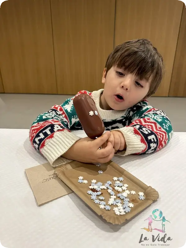 El primero fue un taller de helados en colaboración con Casa Cacao, el proyecto chocolatero de Jordi Roca. Fue toda una experiencia: los niños podían elegir ingredientes, mezclar sabores y ver cómo su helado se convertía en un dulce único. Eric se manchó de arriba abajo (y nosotros un poco también), pero lo disfrutó muchísimo.
