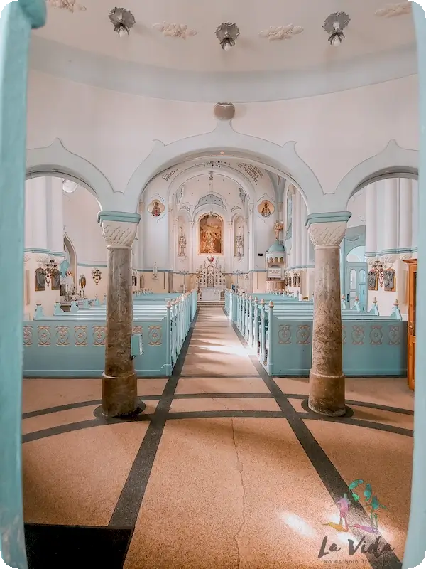 Nuestra experiencia en el interior: Cuando fuimos, la iglesia estaba cerrada al público general, algo que parece ser habitual fuera de las horas de misa. Aun así, pudimos asomarnos a través de la puerta de cristal de la entrada y comprobar que el interior sigue la misma línea cromática, con bancos y techos decorados en azul. Aunque solo la veáis por fuera, el paseo hasta allí merece muchísimo la pena solo por contemplar su originalidad.