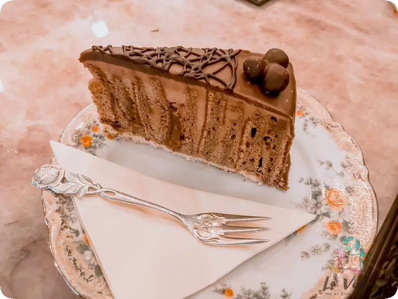 - La degustación: La bebida y el pastel están bien, son de buena calidad, aunque siendo honestos, no es algo «del otro mundo». Lo que realmente estás pagando es el entorno y la vajilla histórica en la que te sirven.