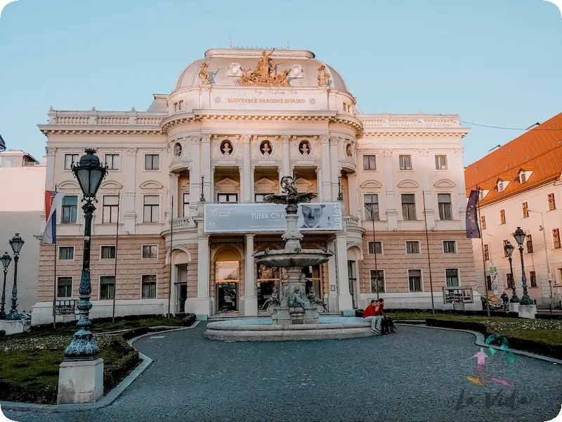 Situado presidiendo la majestuosa plaza Hviezdoslavovo námestie, nos encontramos con el Teatro Nacional de Eslovaquia (Slovenské národné divadlo). Para nosotros, es sin duda uno de los edificios más bonitos y elegantes de toda Bratislava, destacando por su fachada blanca impecable que resalta sobre el resto del entorno.