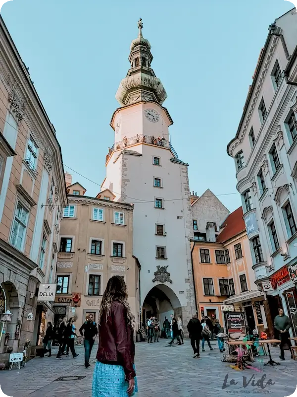 Junto al Castillo, la Puerta de San Miguel (Michalská brána) es, sin duda, el símbolo más icónico de Bratislava. Para entender su importancia, hay que saber que era una de las cuatro puertas principales de acceso que protegían la antigua muralla medieval, y es la única que todavía se mantiene en pie.
