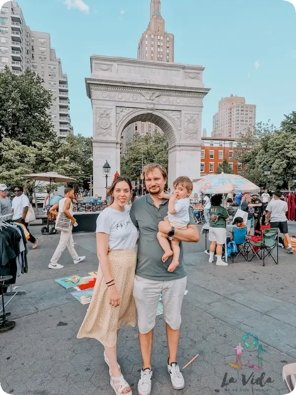 Foto familiar en Washington Square Park, con el Arco del Triunfo de fondo