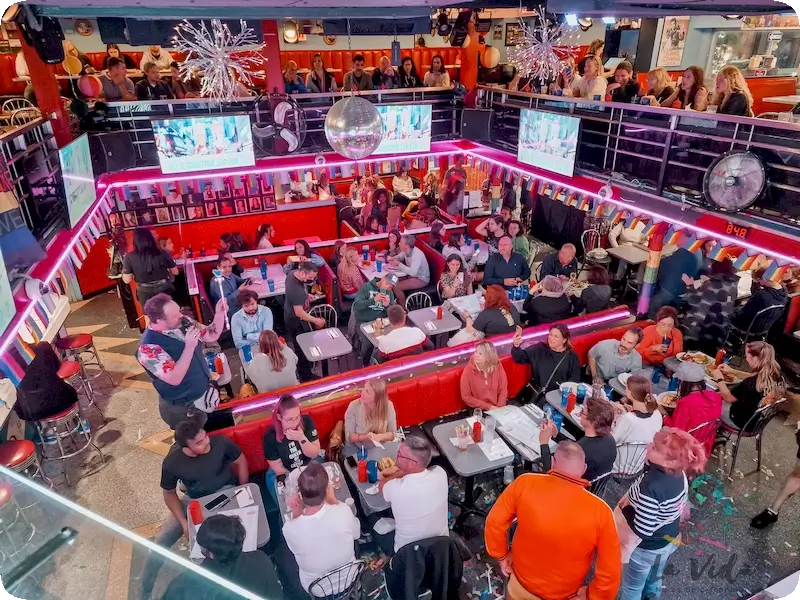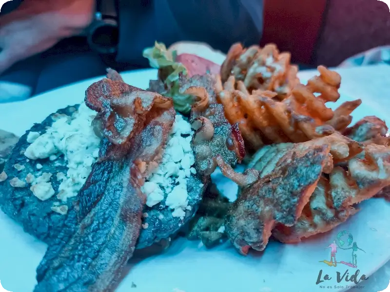 La comida es tipo diner americano (hamburguesas, batidos…) y, aunque es mejorable, vas por el show. Suele haber cola en la puerta, pero va rápido. ¡A los niños les deja con la boca abierta!