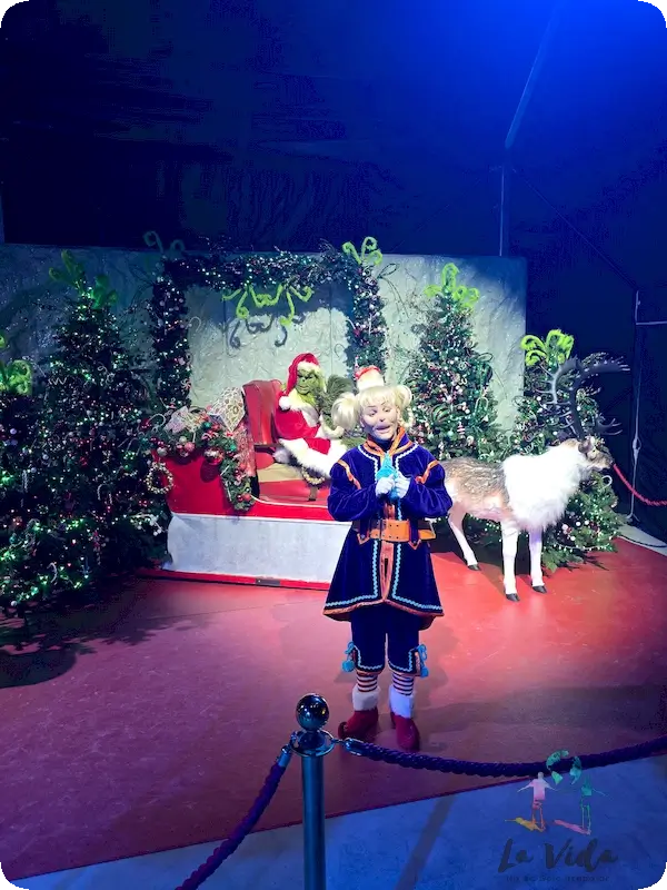 Es una zona con actuaciones breves, actividades infantiles, puestos de comida y personajes como el Grinch. Añade un rato extra de entretenimiento tras el recorrido.